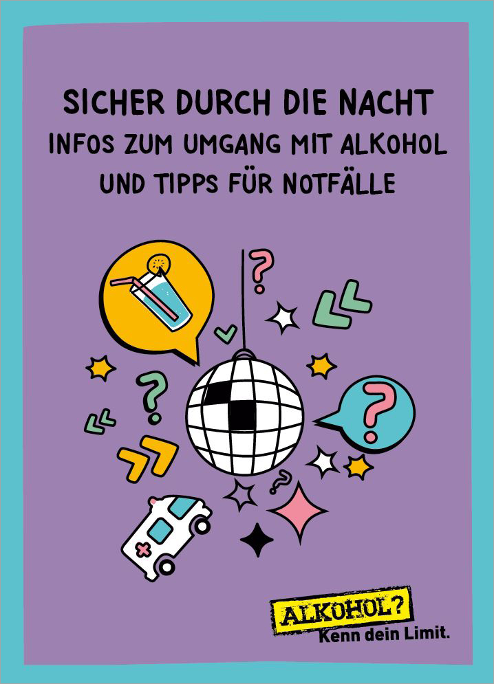 Die Broschüre "Sicher durch die Nacht" zur Kampagne "Alkohol? Kenn dein Limit." enthält Informationen zum sicheren Umgang mit Alkohol bei Partys und gibt den Jugendlichen Tipps zum Verhalten bei Alkohol-Notfällen.